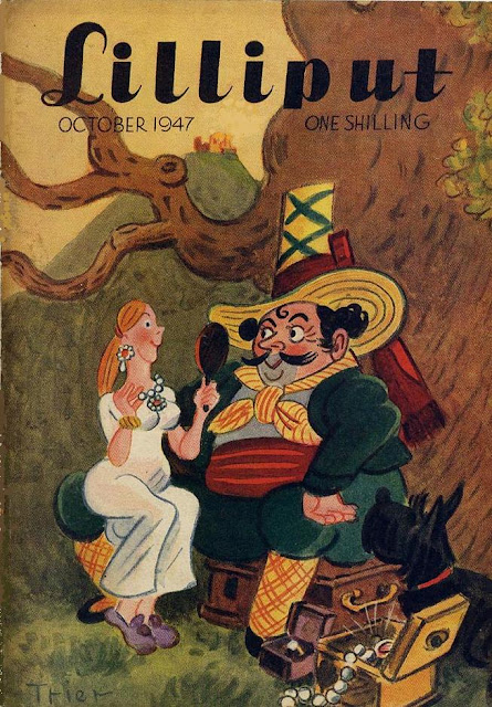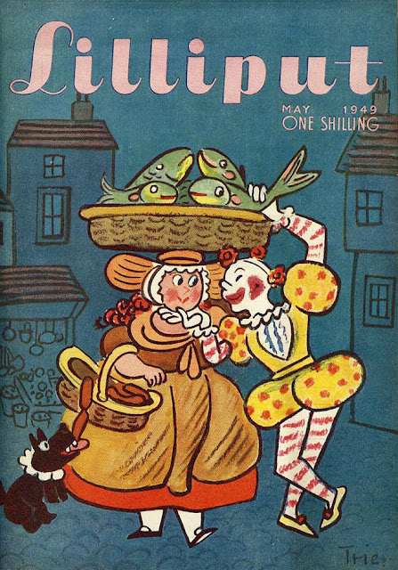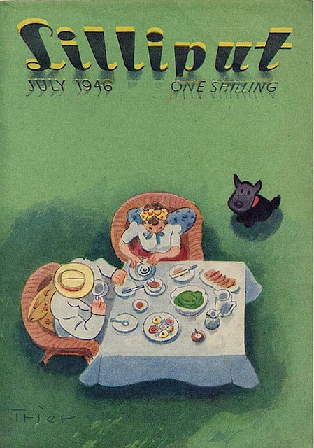 Walter Trier provided the front cover design for every issue of Lilliput from its start until 1949. Each time, the design employed a man, a woman, and a dog. The man and woman were usually young and almost always a couple, the dog was almost always black. It seems the original dog was Trier's. It was run over by a tram and killed,and since then Trier immortalised him in his Lilliput covers; the idea was light-hearted and the settings and styles varied considerably.