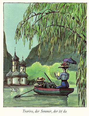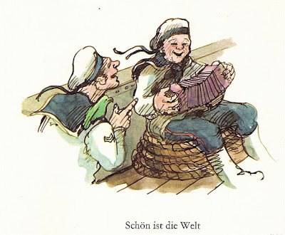 Im Zürcher Kunsthaus wurde diese Woche die Tomi-Ungerer-Ausstellung Incognito eröffnet. Tomi Ungerer wird am 24. November 84 Jahre alt. Zu diesem Anlass möchte ich eine Auswahl von Bildern aus seinem grossen Liederbuch zeigen, das 1975 im Diogenes Verlag erschien.